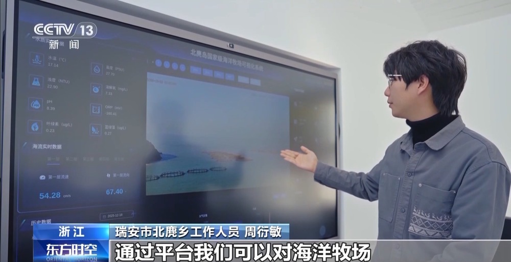 瑞安市北麂乡工作人员 周衍敏:通过平台,我们大家可以对海洋牧场所在海域的实时影像、水下影像、气象、水质进行全方位的监测,确保海洋生态养护效果。