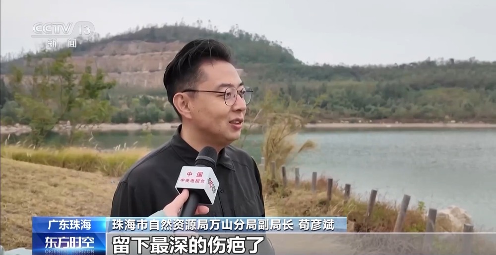 珠海市自然资源局万山分局副局长 苟彦斌:之前它是一个很深的矿山开采的矿坑,能够说是之前三角岛留下最深的伤疤了。但是现在把海水淡化成淡水,注入湖泊里面,已形成了天然矿湖的形态。